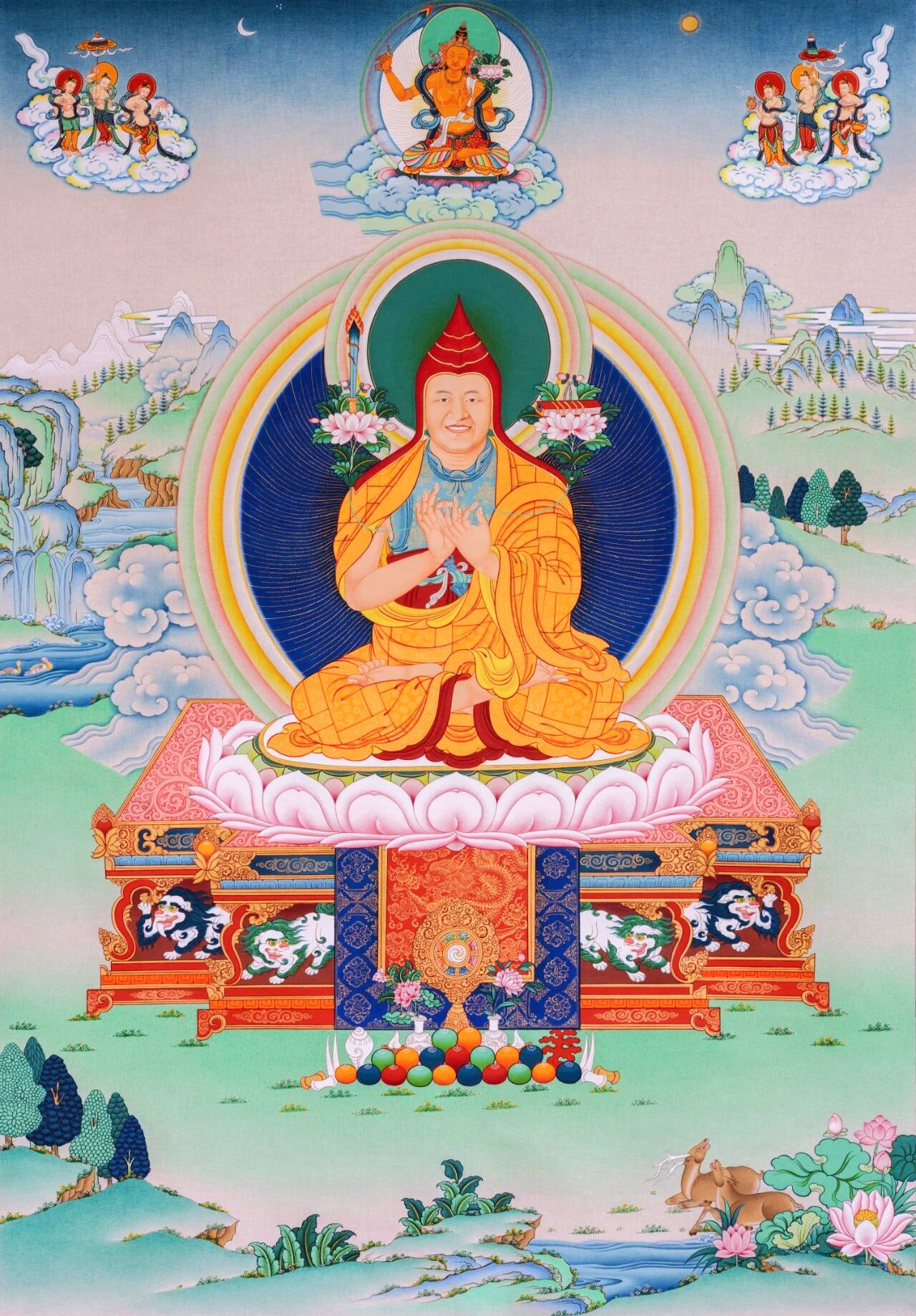 不论修学何法,应当遵循诸位传承祖师的足迹。诸见闻有缘者,应精勤祈祷修持文殊智慧本尊——完全的遵循,带来完全的成就。