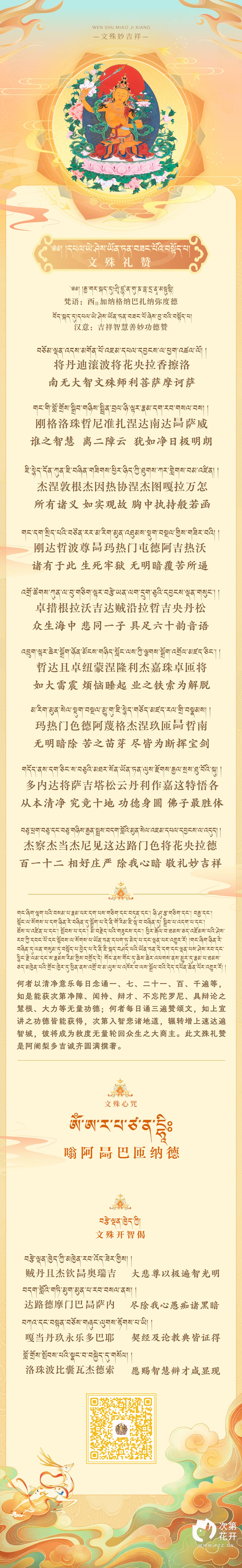《文殊礼赞》全名为《吉祥智慧善妙功德赞》,为阿阇黎多吉诚齐所造,另有相传为五百位大班智达相约每人撰著一篇文殊菩萨的赞颂文,稀奇之处为,每位班智达所写的词句完全一致,即是《文殊礼赞》。