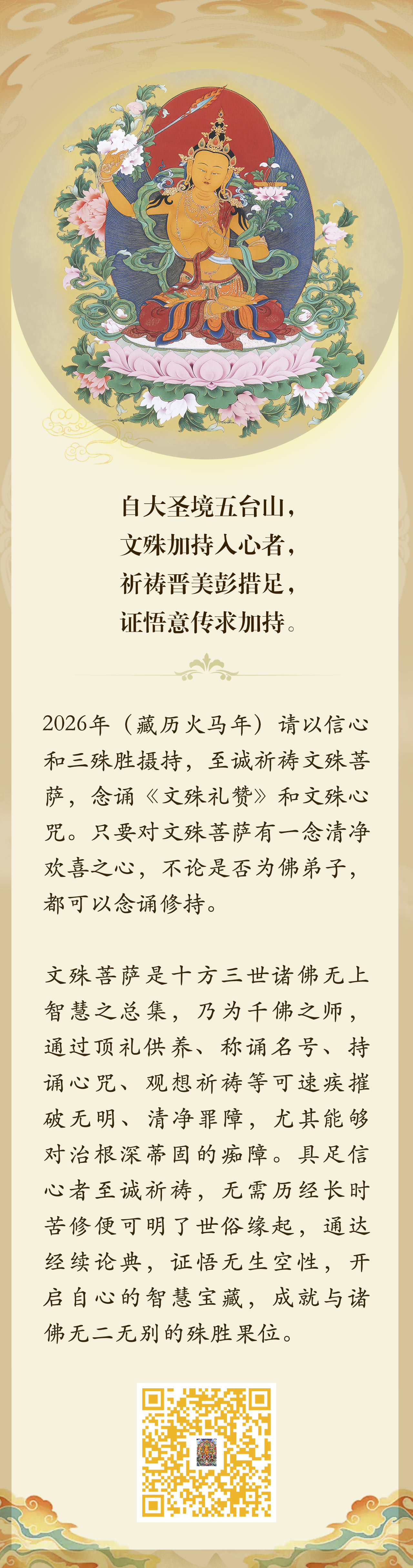 若终身修持文殊本尊,可按照传统方式发愿此生命终前念诵一亿或多亿遍文殊心咒,且今年念诵数量亦可摄入其中。